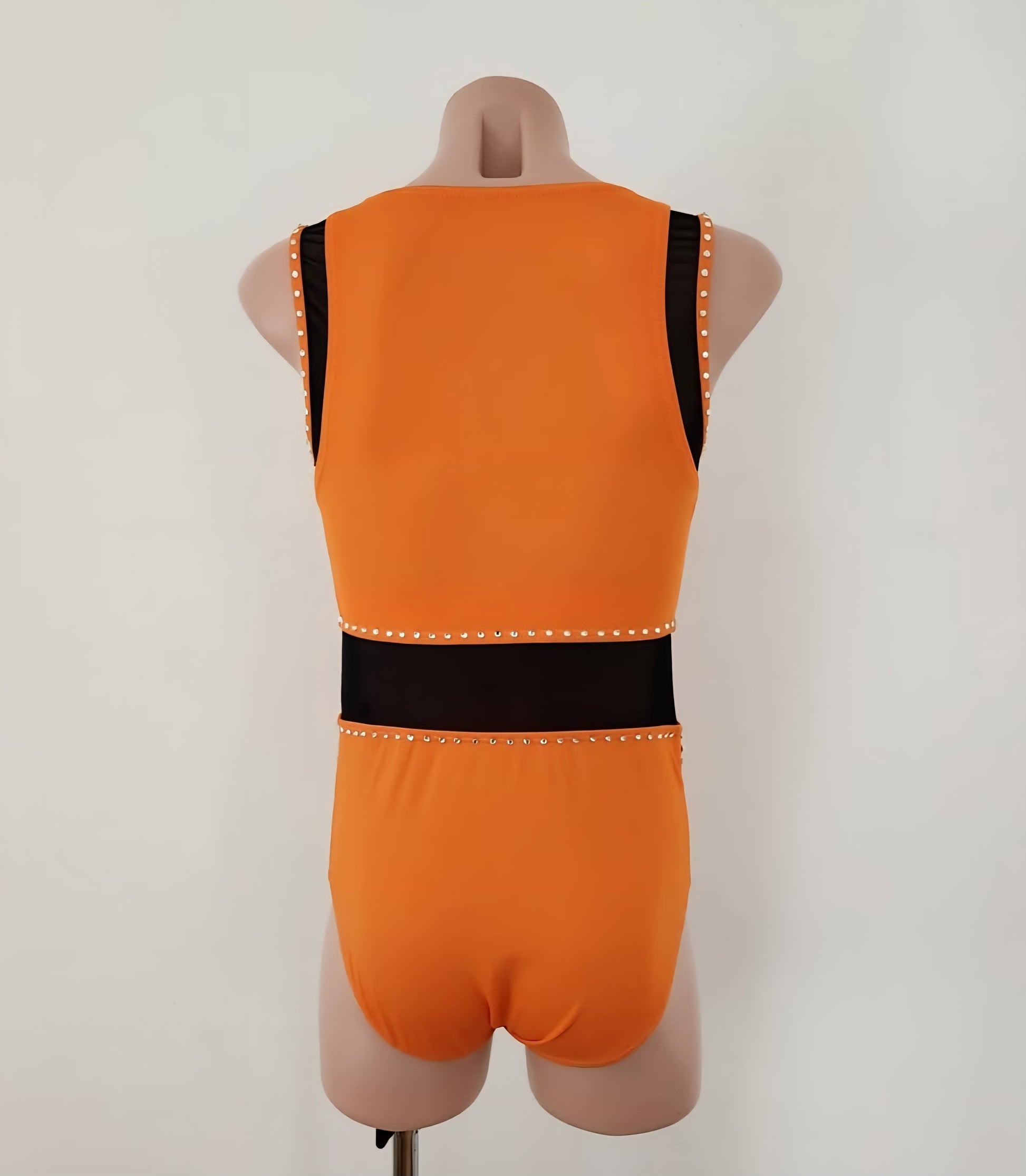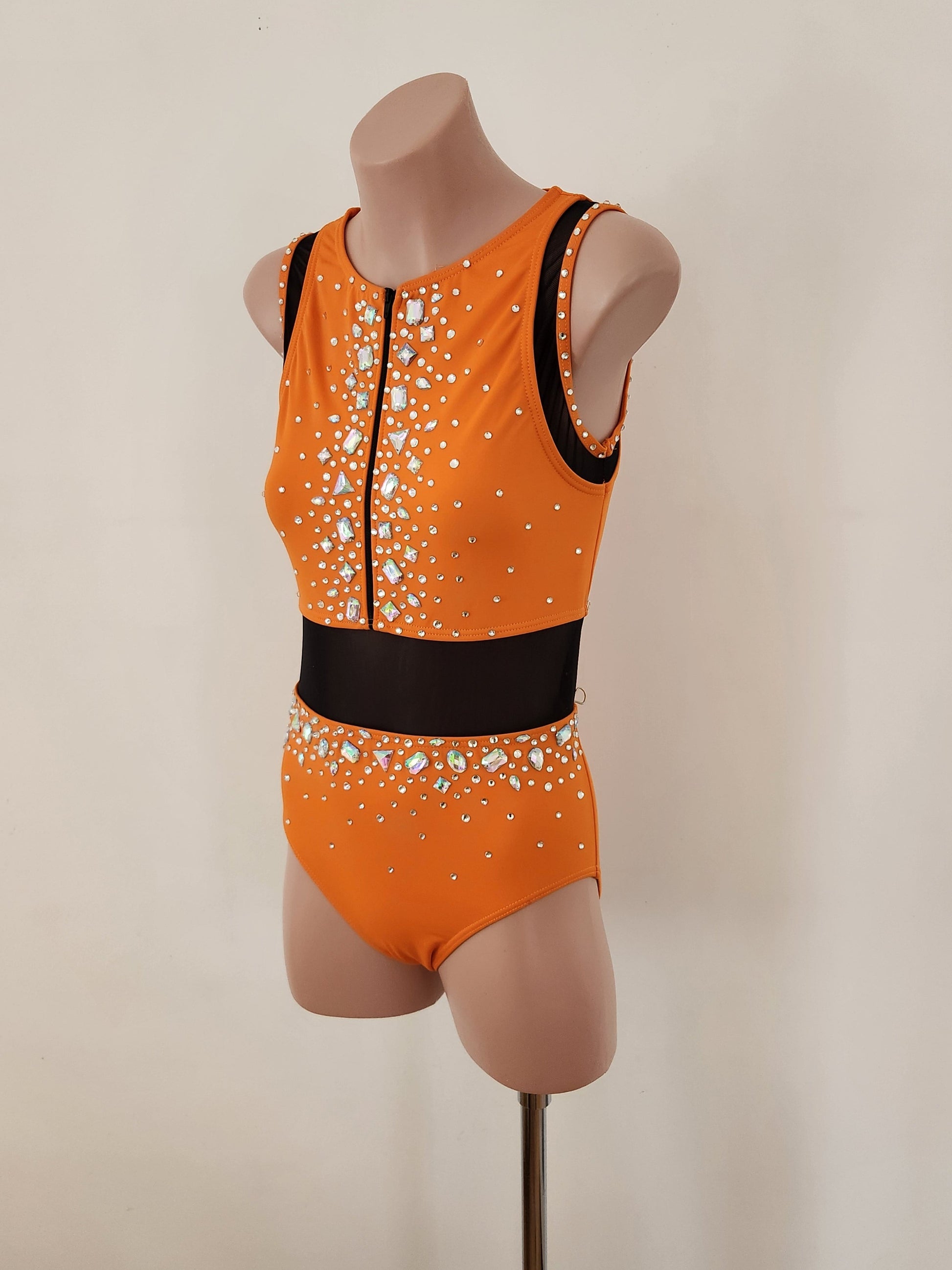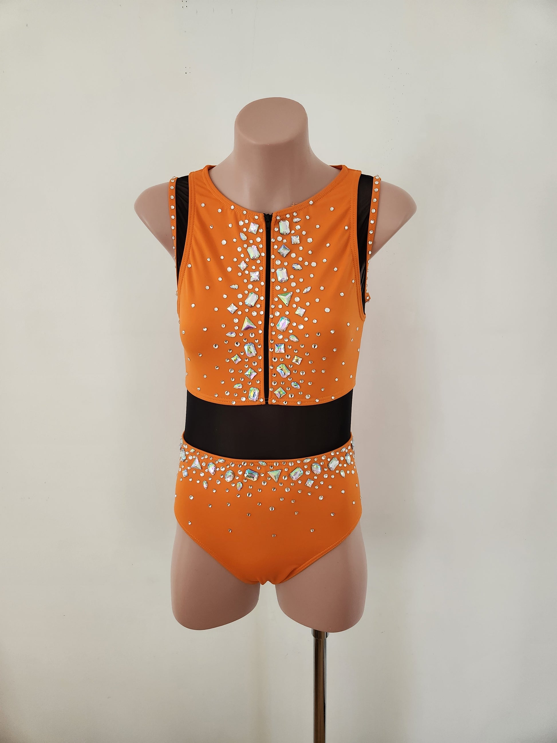 Balera large child base in great condition upcycled to a striking costume with hundreds of rhinestones. Zip up front with black mesh accents. Great for a jazz routine, paired with black spats.