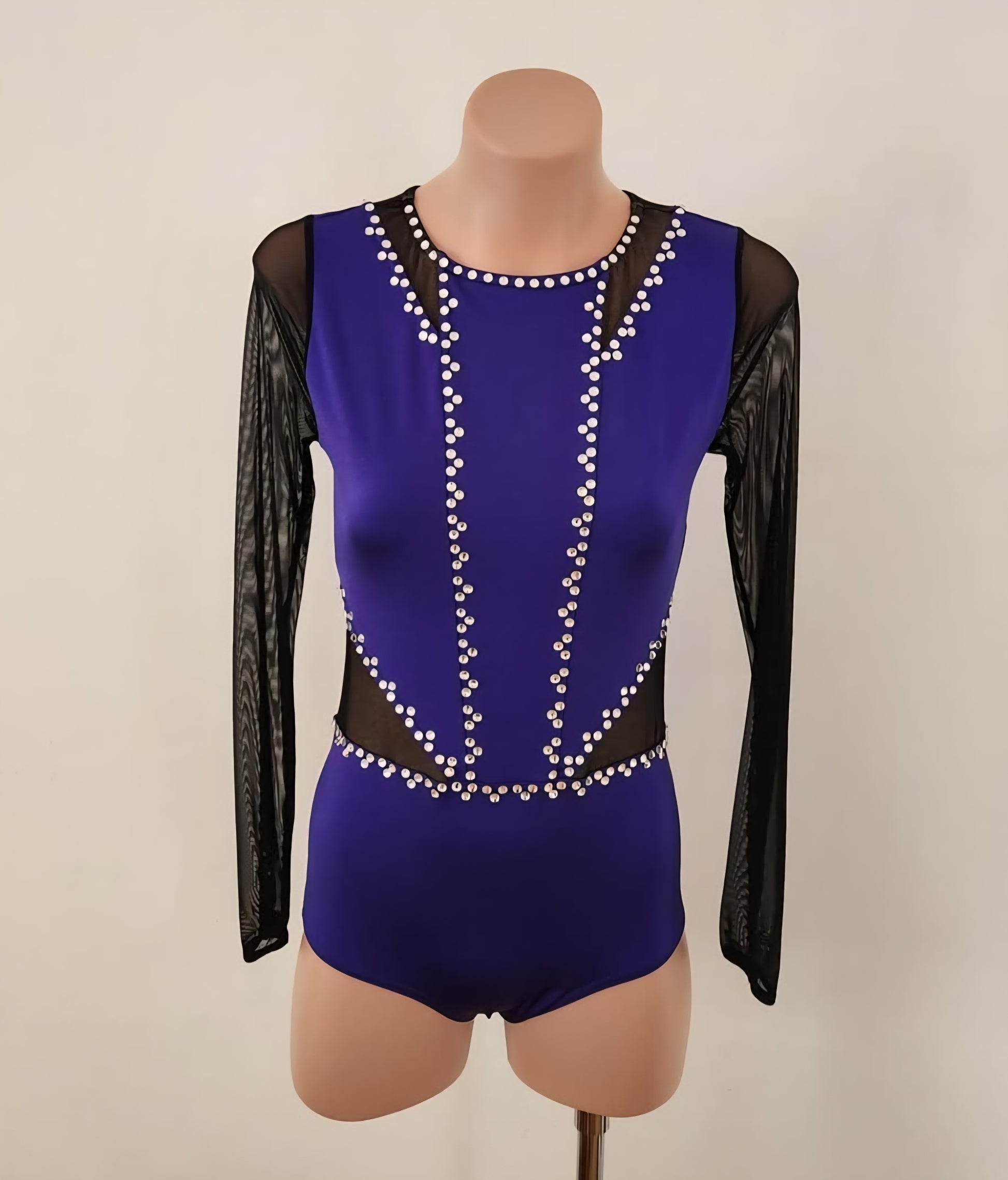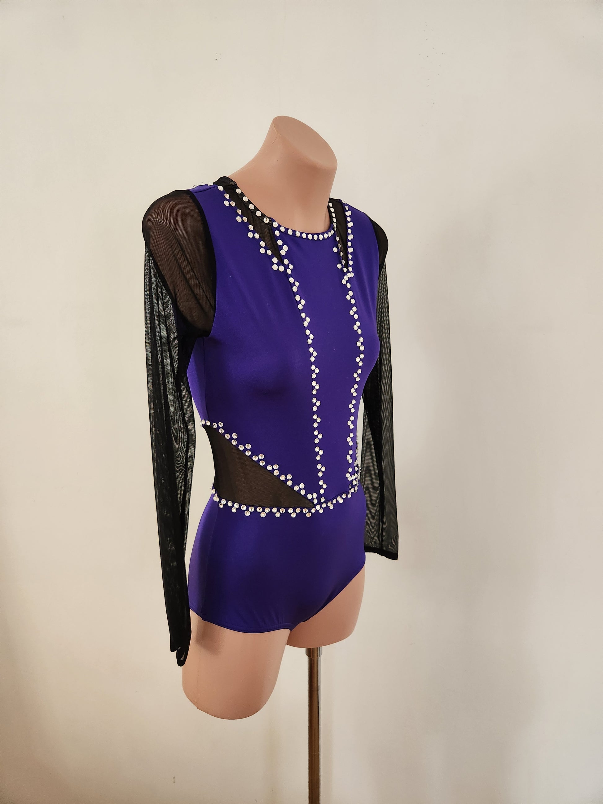 Weissman large child base in great condition upcycled to a striking costume with hundreds of quality rhinestones. Sleeves and cutouts are black mesh. Great for a jazz routine, paired with black spats.