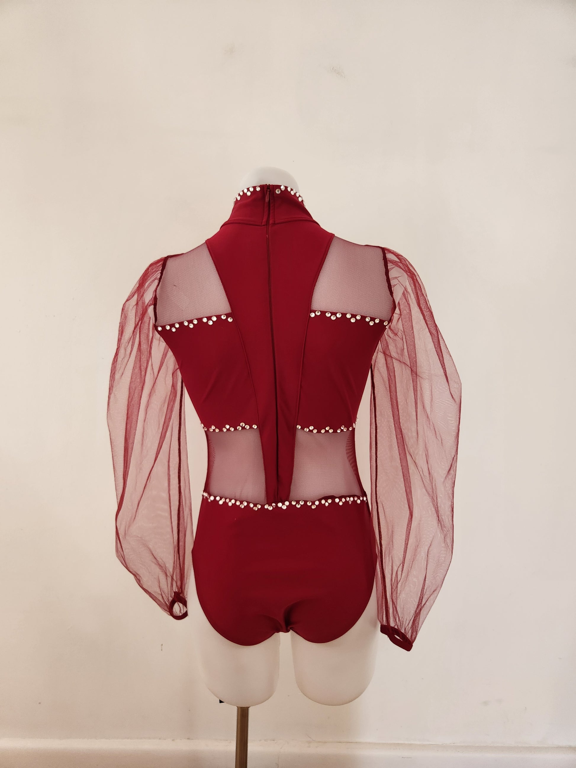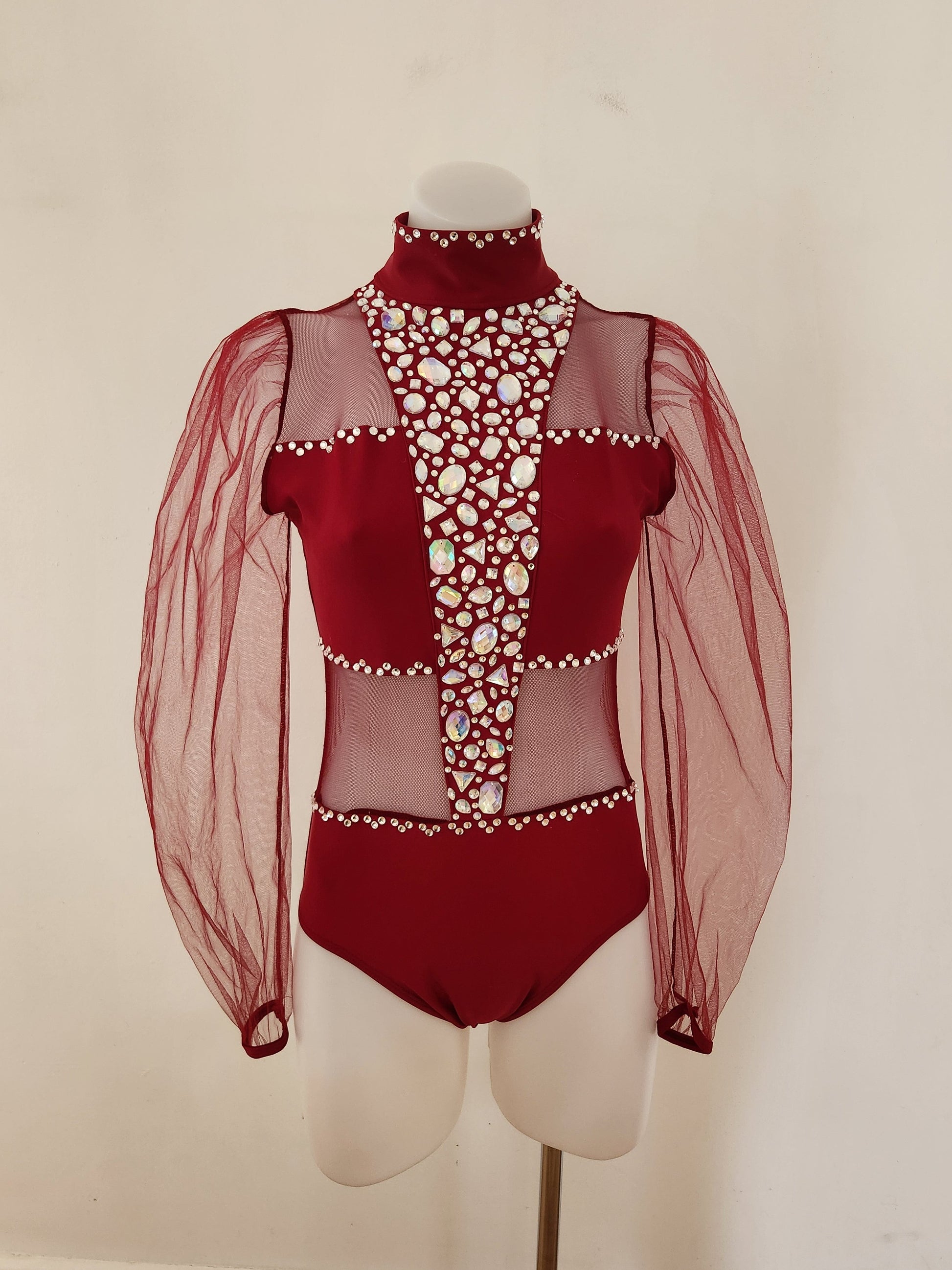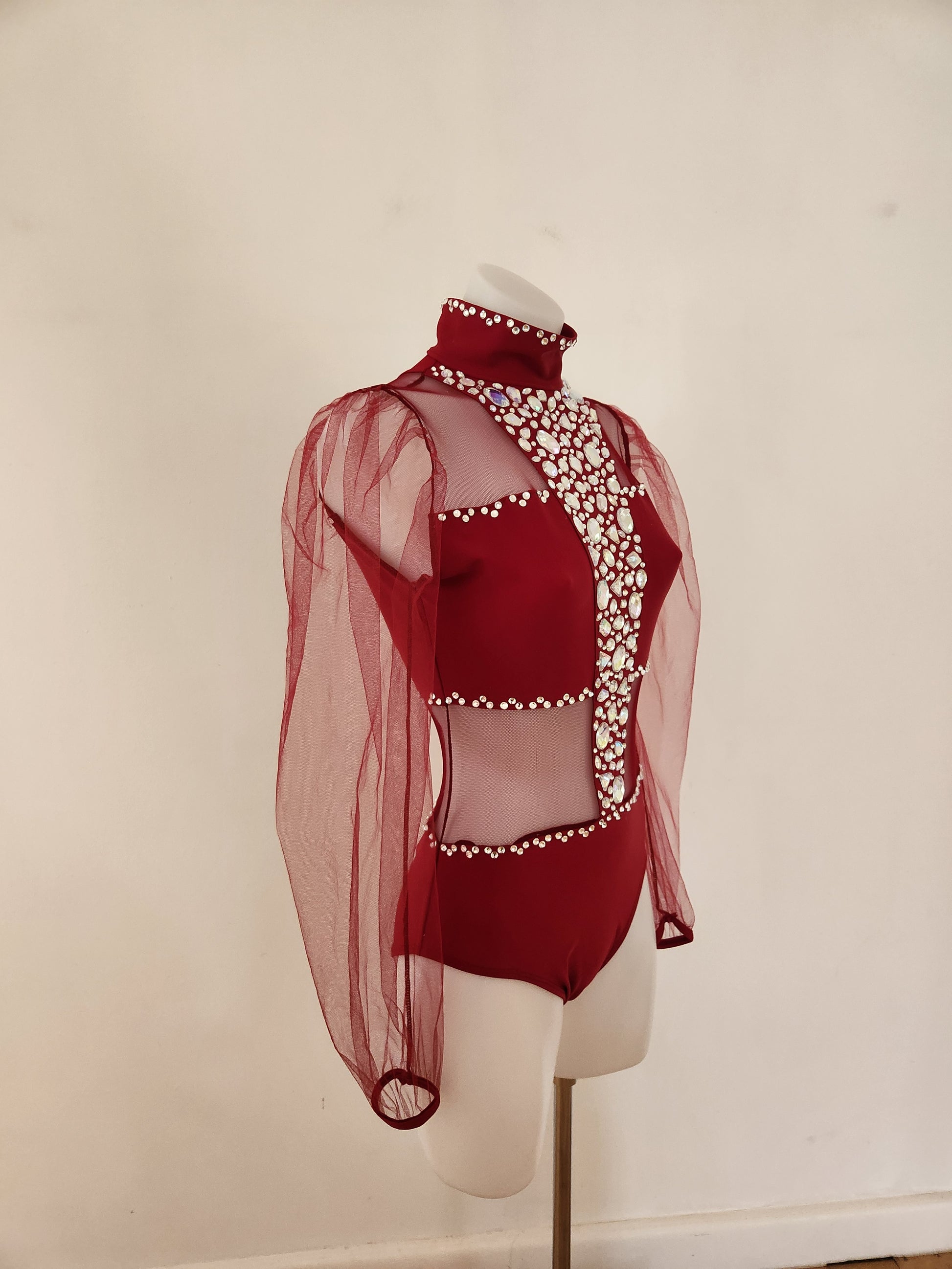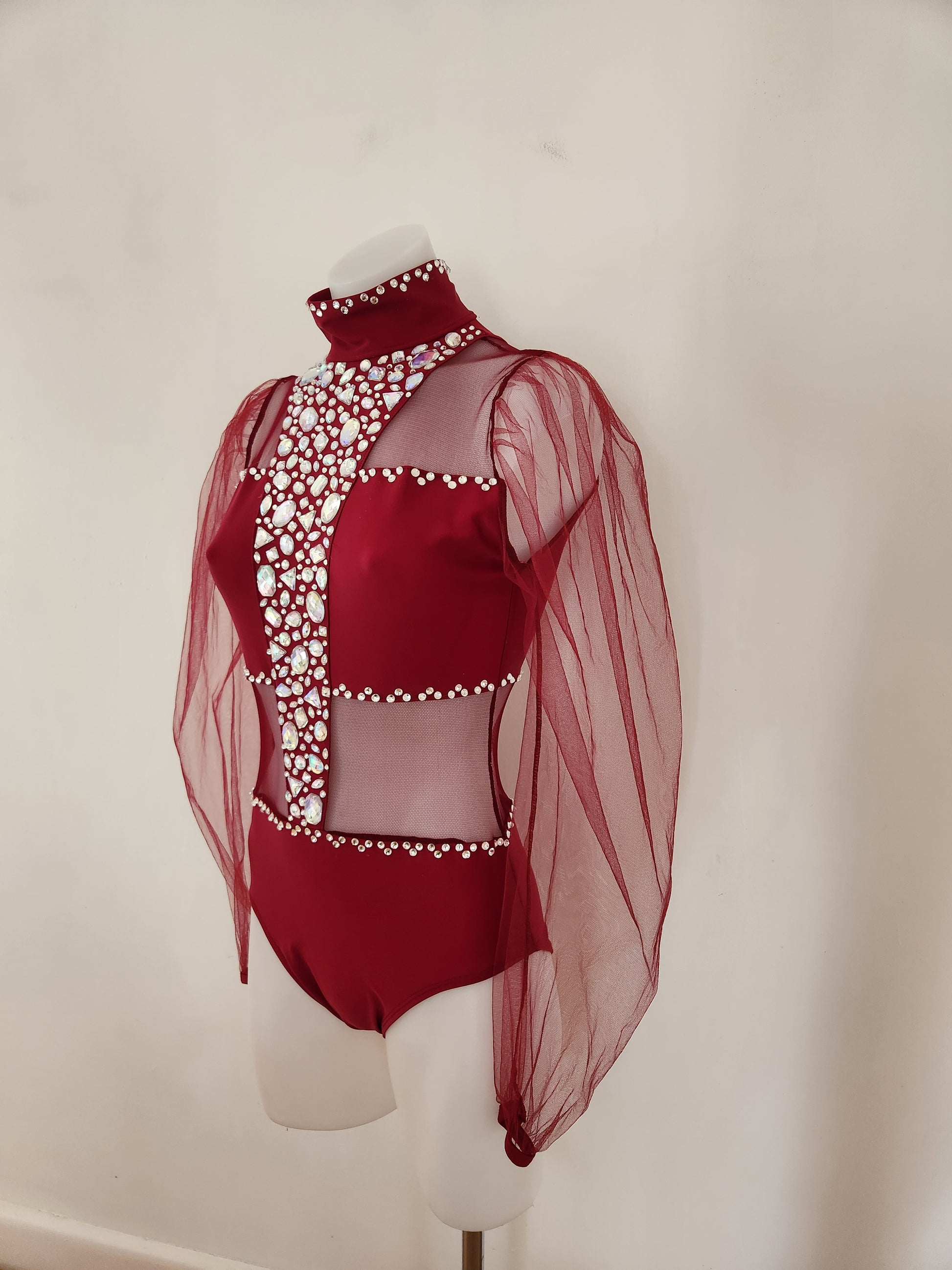 Striking burgundy costume in excellent condition embellished with acrylic and crystal gems to sparkle on stage. Whilst pre-loved, the costume is in 'as new' condition. The label says SA, but it easily fits on my Australian size 12 adult board with the following measurements.