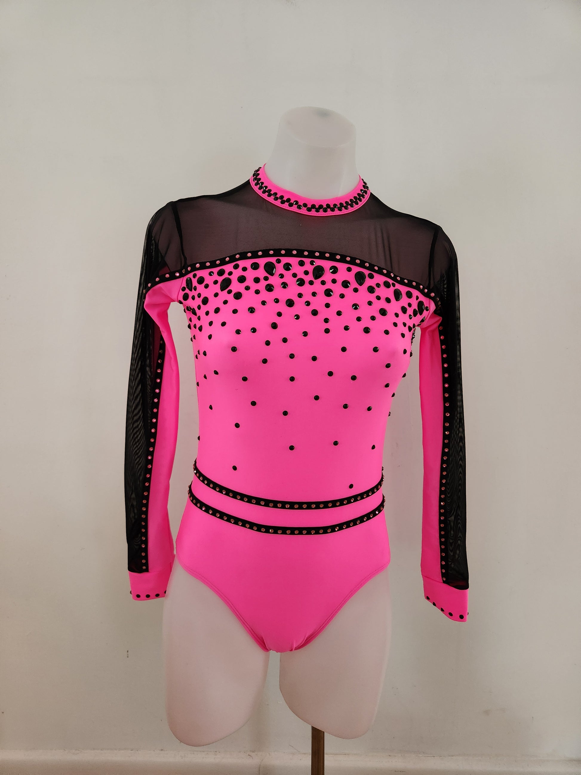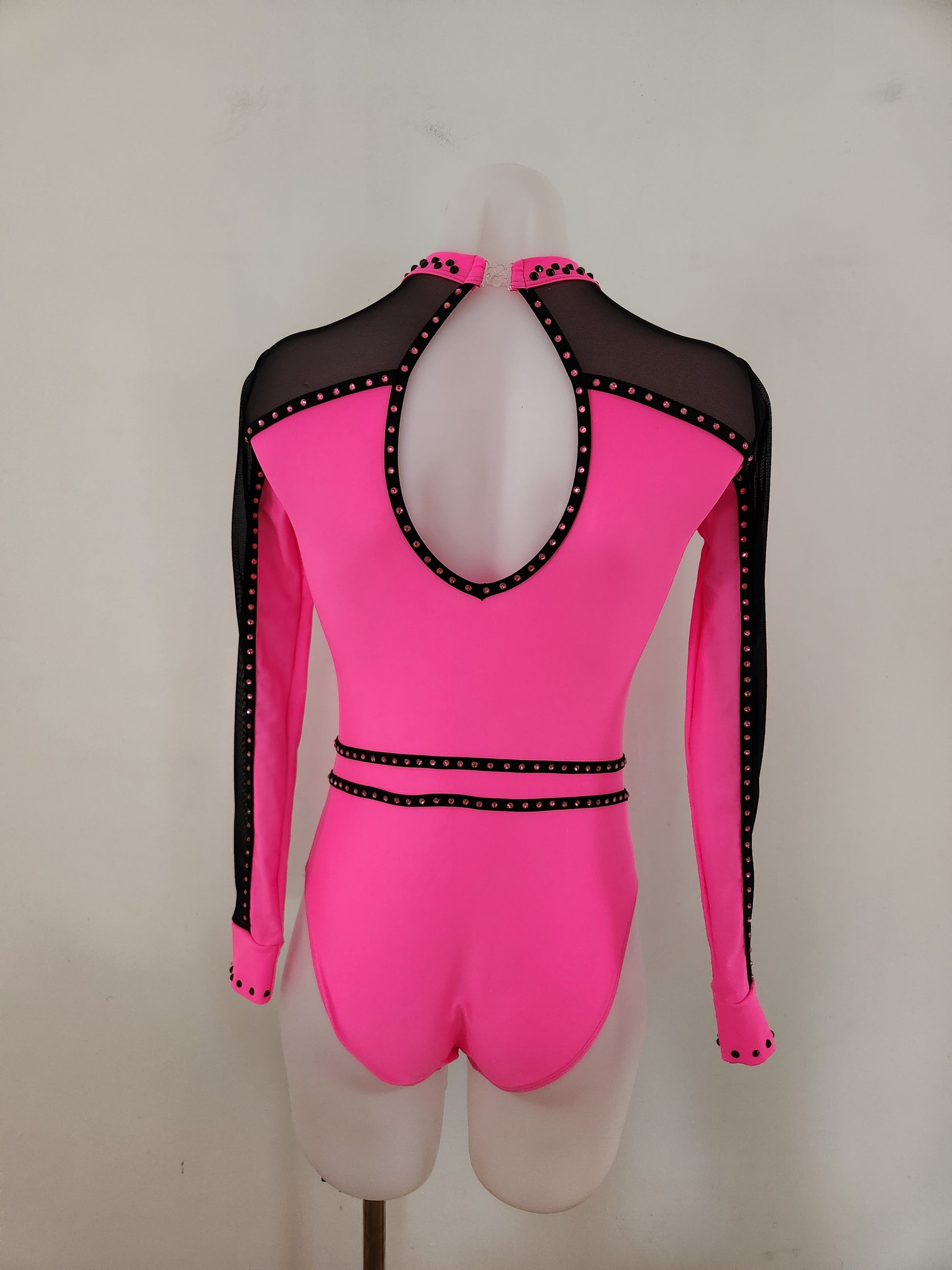 CosiG SA neon pink and black mesh leotard blinged with pink and black gems. Each arm has two lines of pink rhinestones. This costume has never been worn, however the paper tag is missing (though the plastic kimble tag is still attached).