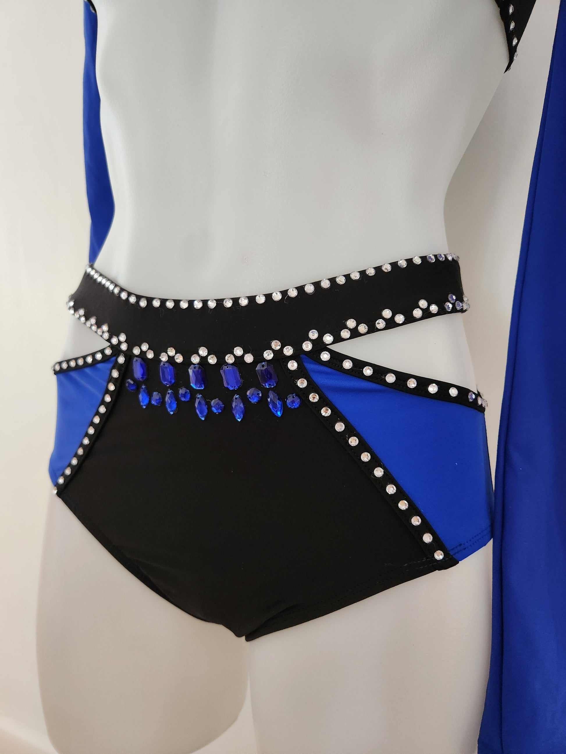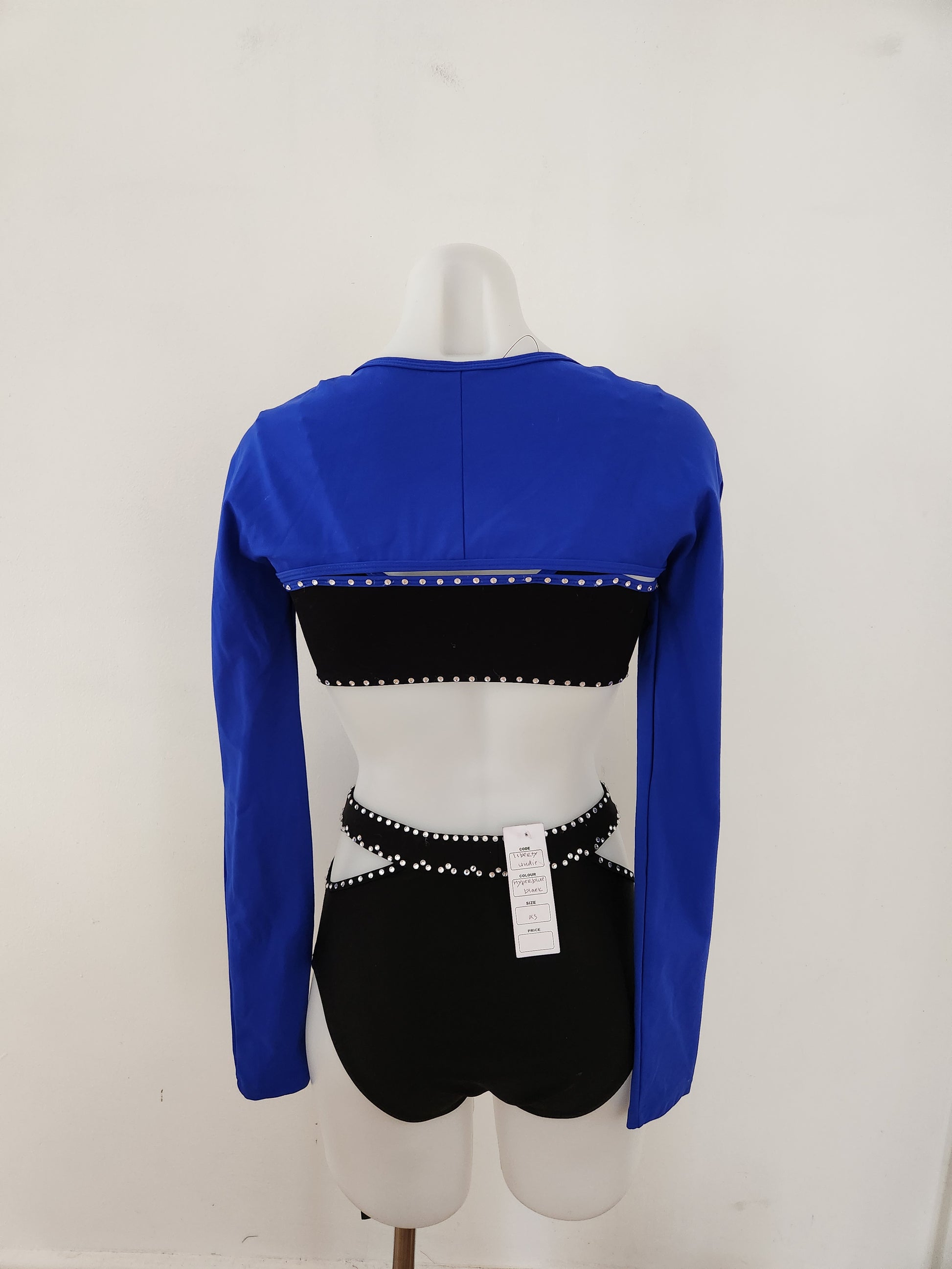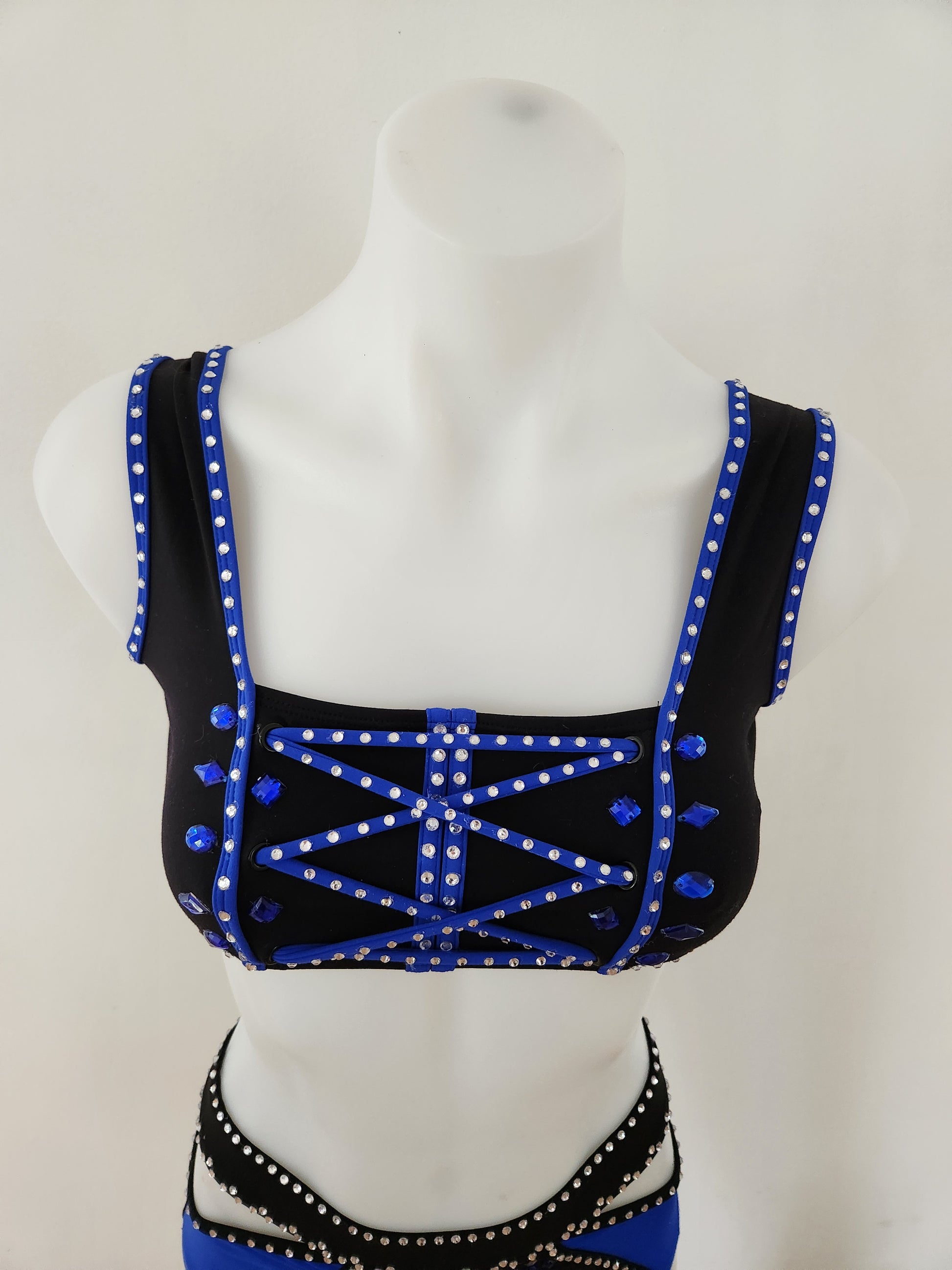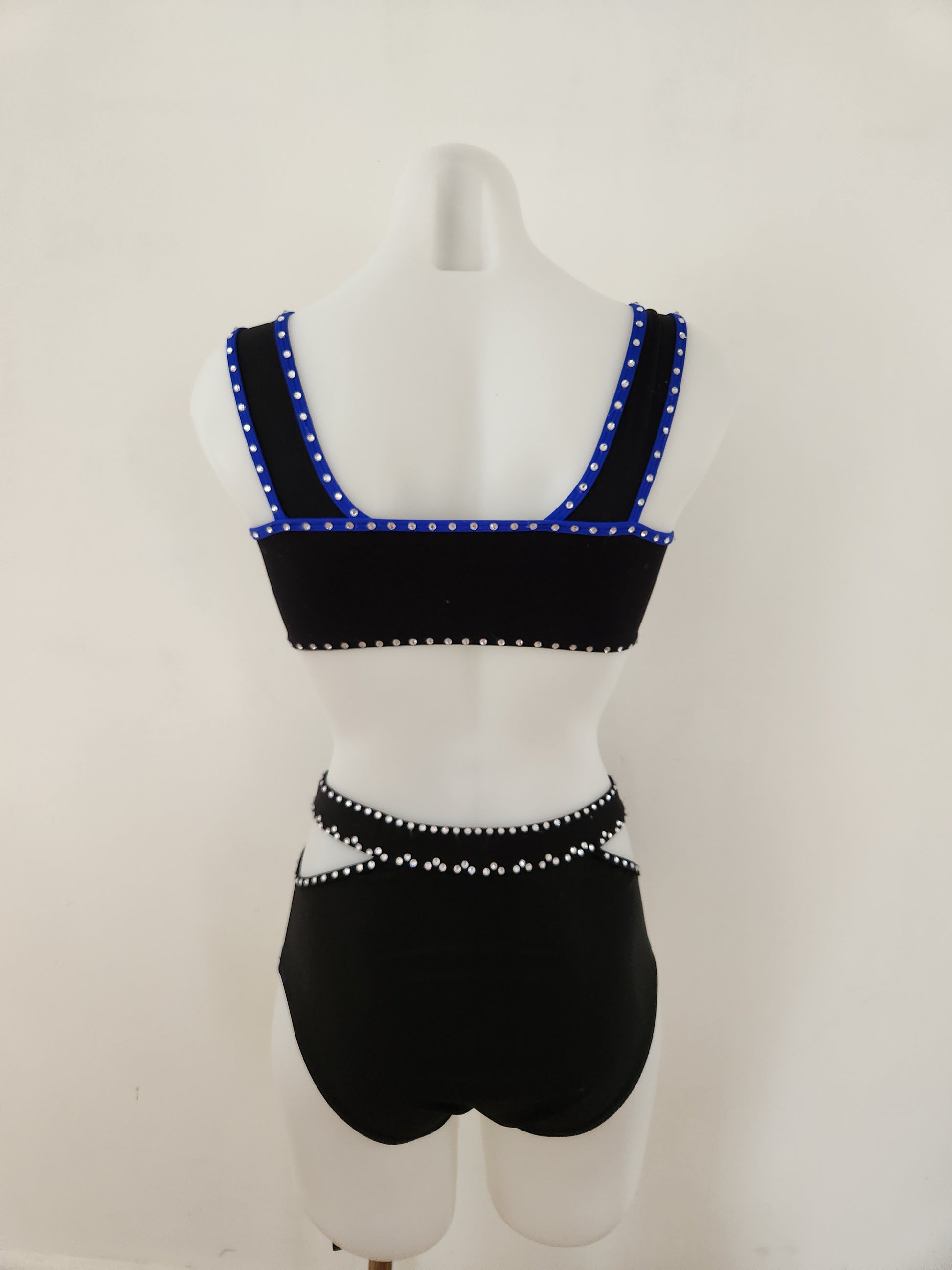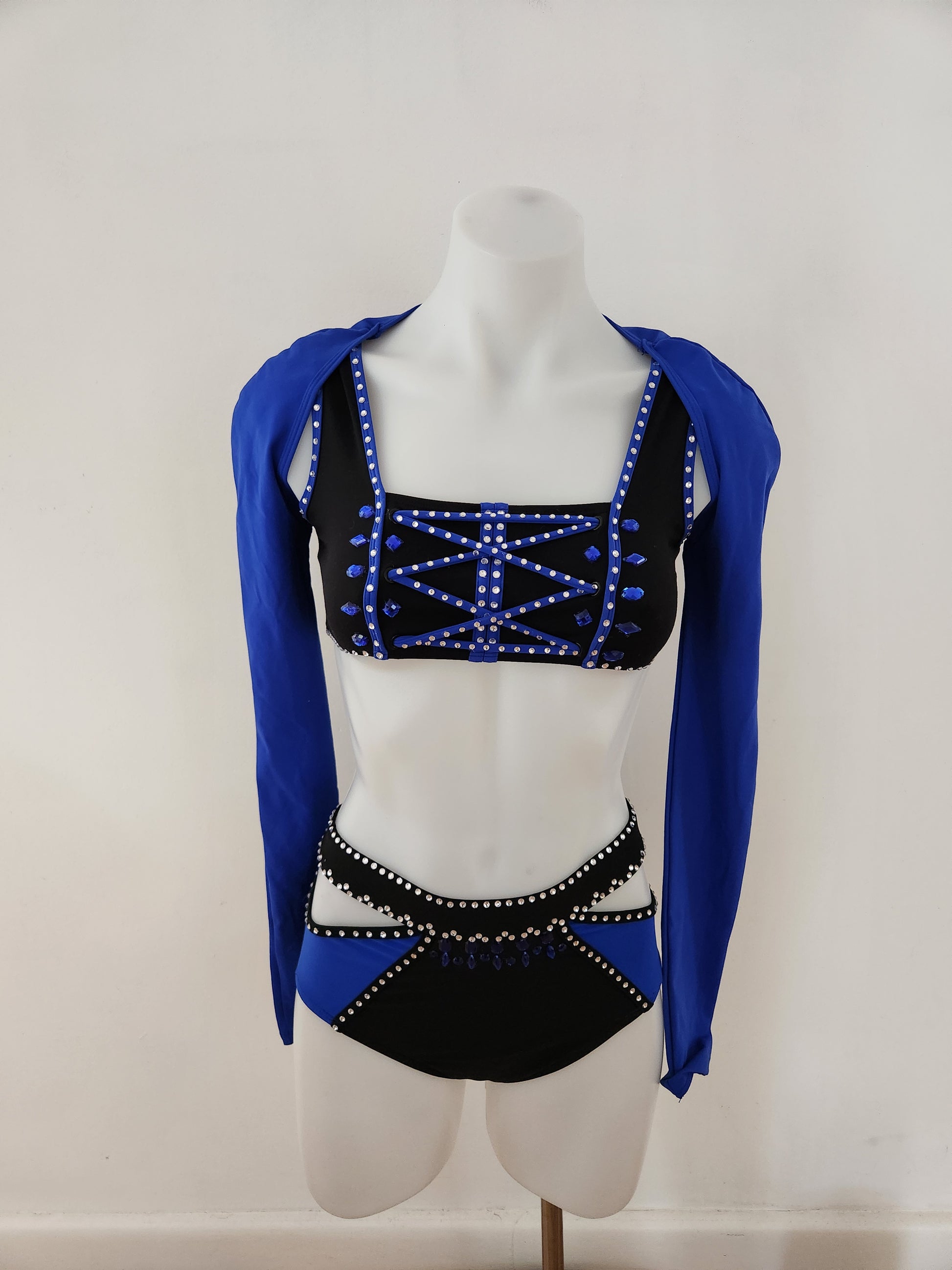 CosiG crop, knickers and shrug. Brand new, blinged with crystal and blue acrylic gems. The knickers are labelled XSA and the shrug and crop have an S on their tags (the tops are sample garments, whilst the knickers have CosiG retail tags attached. The matching set all fits on my size 8 adult body board and size 8 mannequin with measurements below. Depending on build, this could fit a 12-14 year old child.