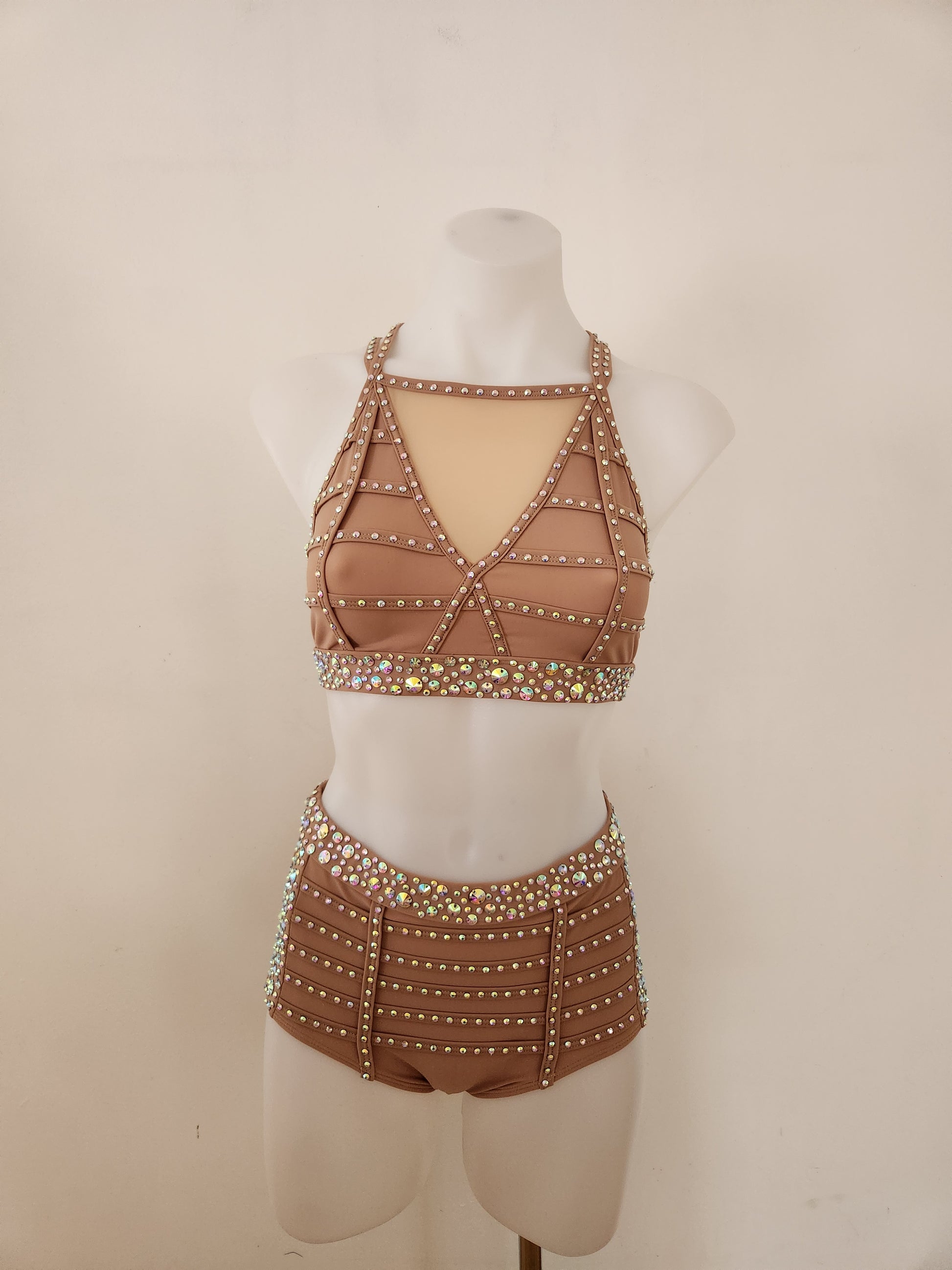 Cosi G small adult upcycled set, embellished with hundreds of AB gems that will really sparkle on stage. Whilst pre-loved, the costume is in excellent condition. It is thick and stretchy.