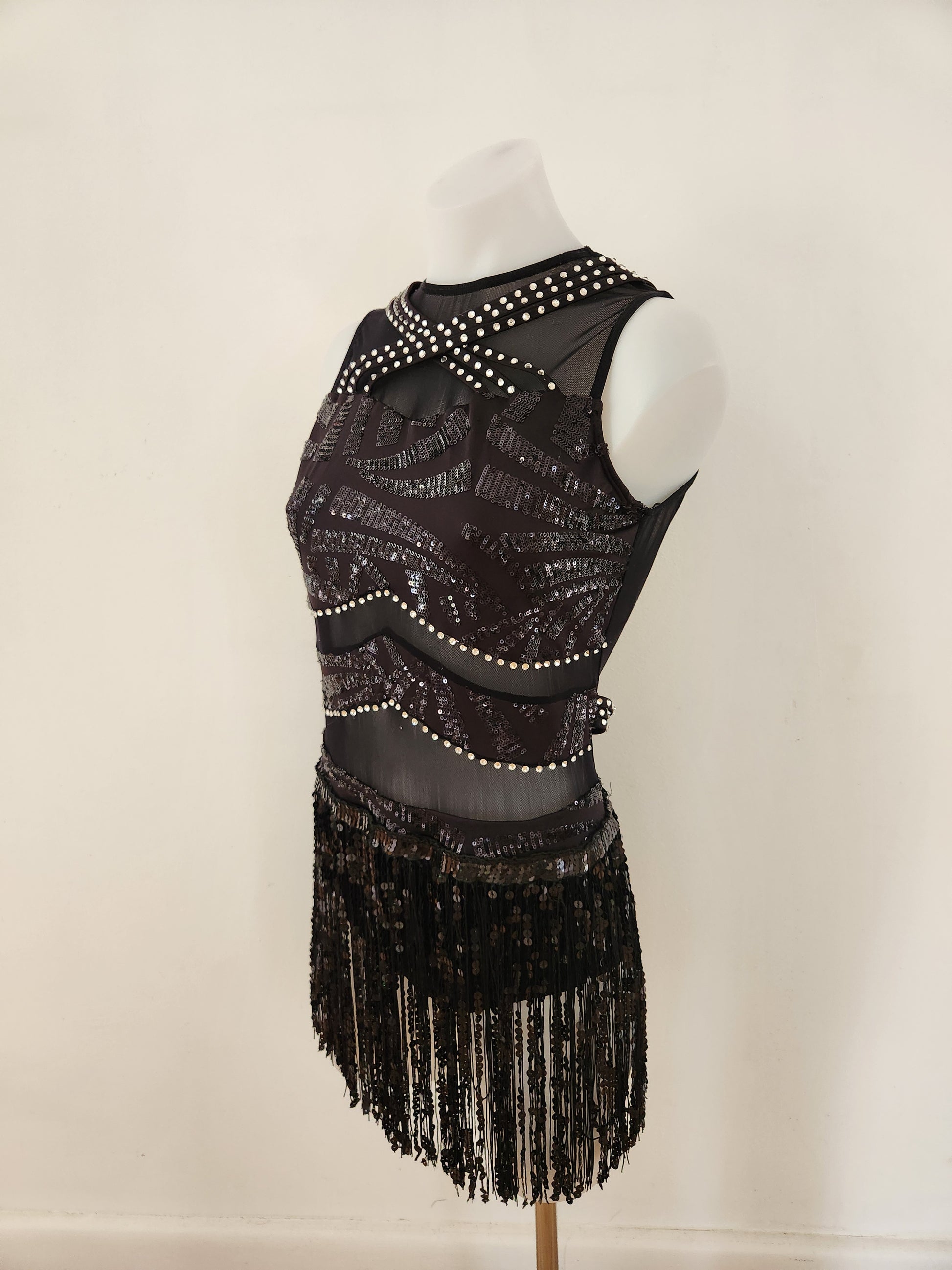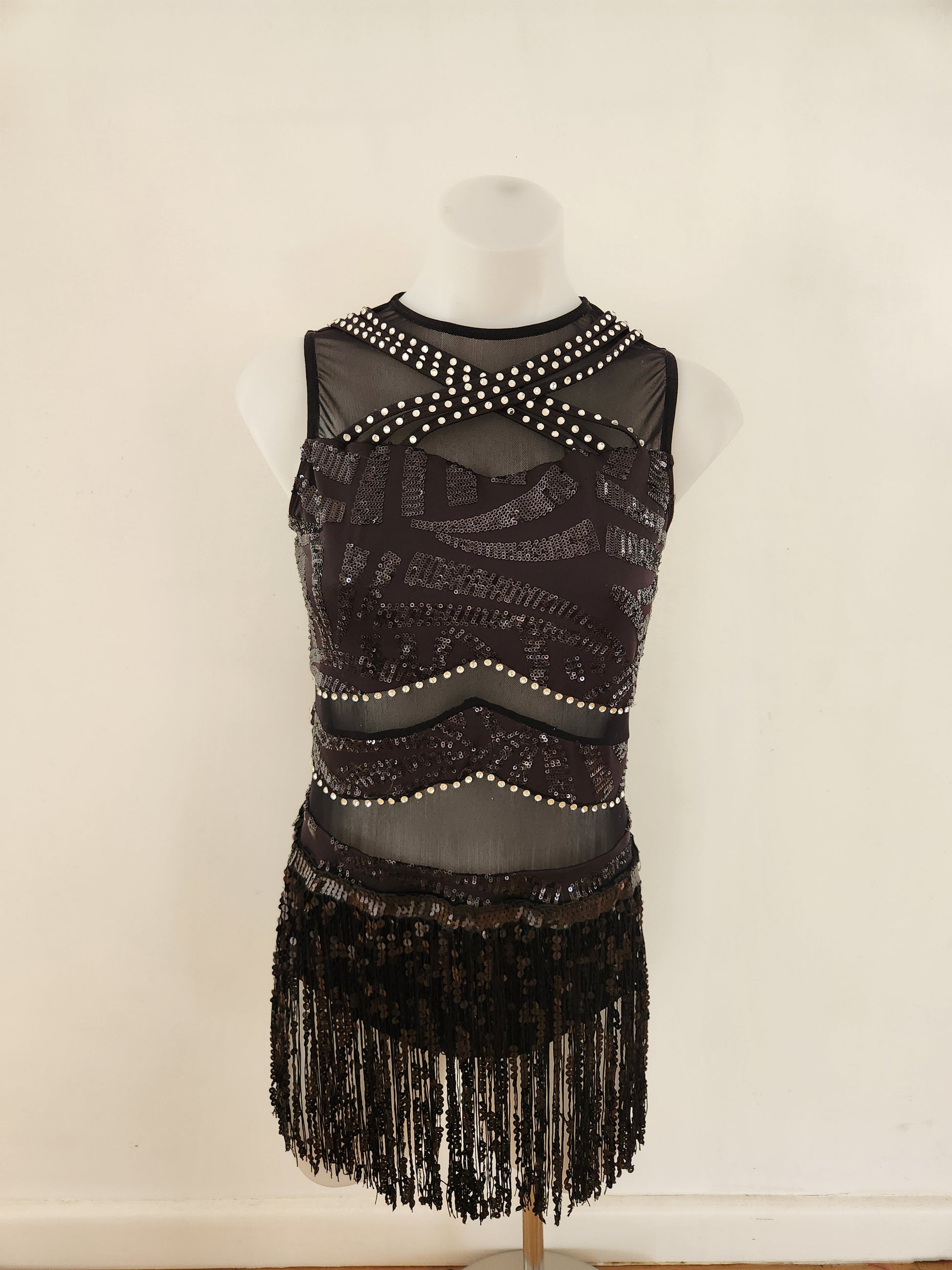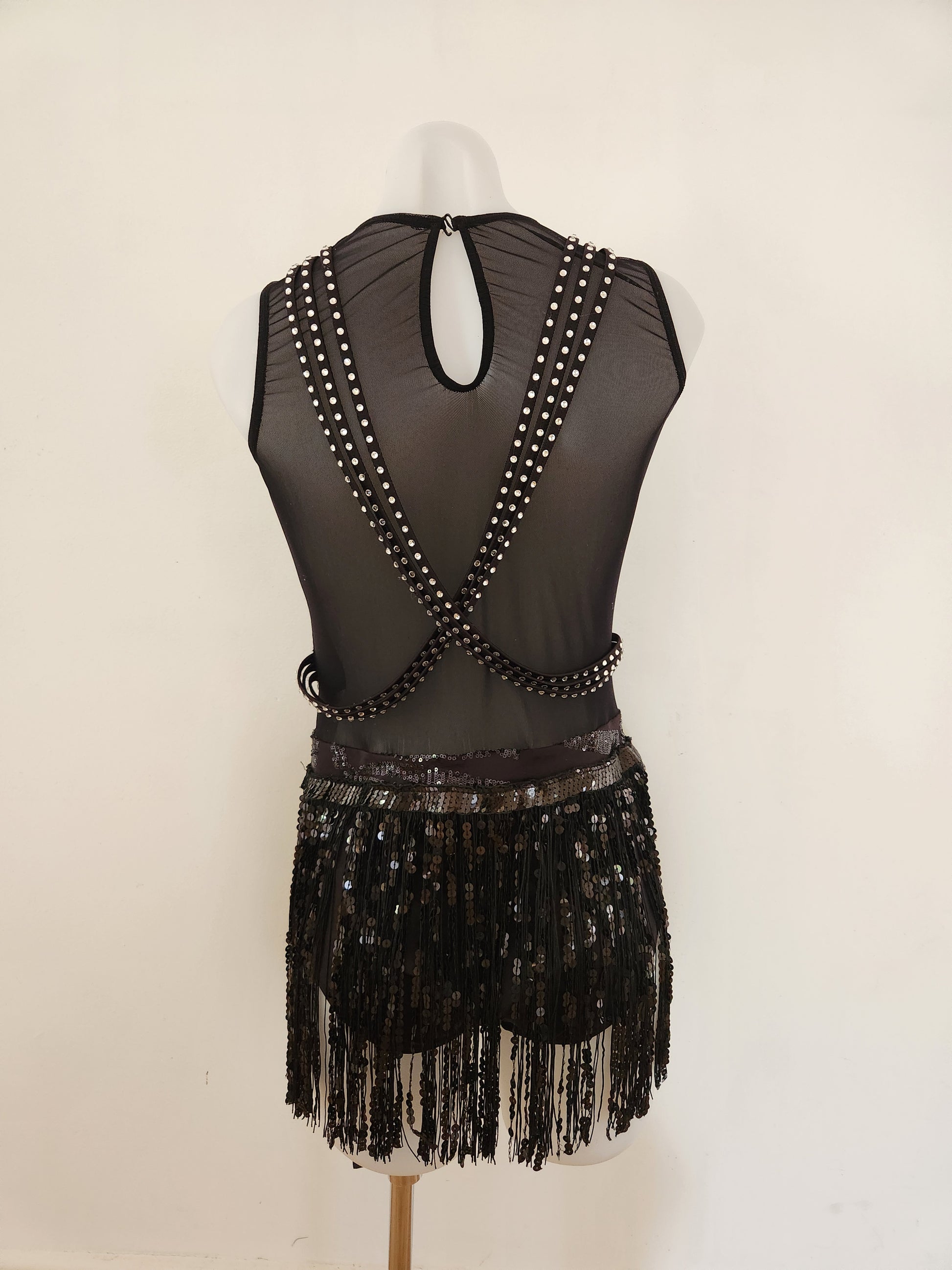 Pre-loved LA Stage Boutique costume in excellent condition with added crystal rhinestones front and back. The three straps on each side add a bit of interest to this classic Broadway jazz look.