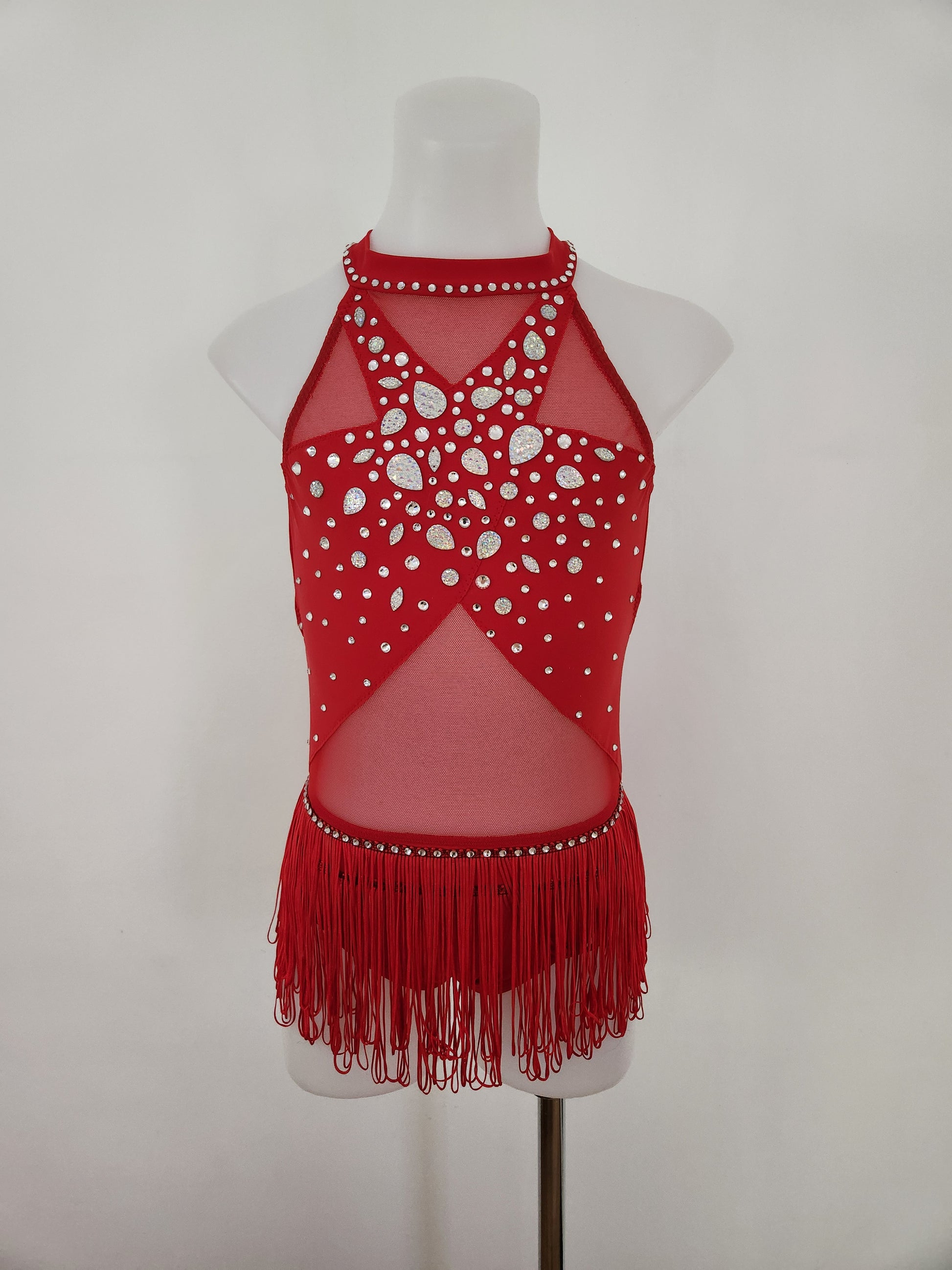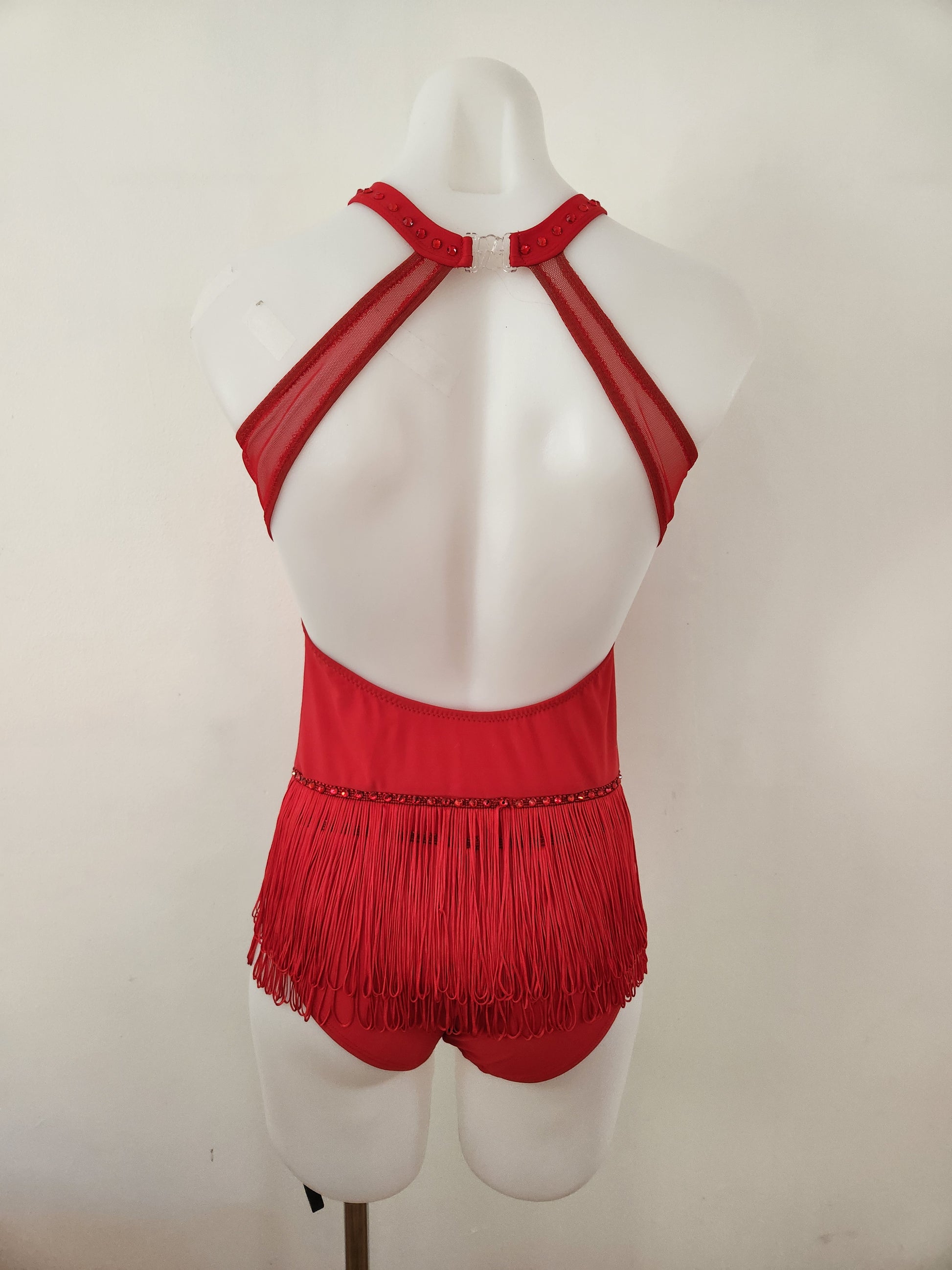 This brand-new base made by Couture Costume Dancewear in Melbourne is a girls size 10. The fully lined base has been embellished with crystal rhinestones to sparkle on stage. There are two layers of tassels which match the bright red fabric perfectly. With mesh cutouts adding interest, this is a standout jazz or tap costume.
