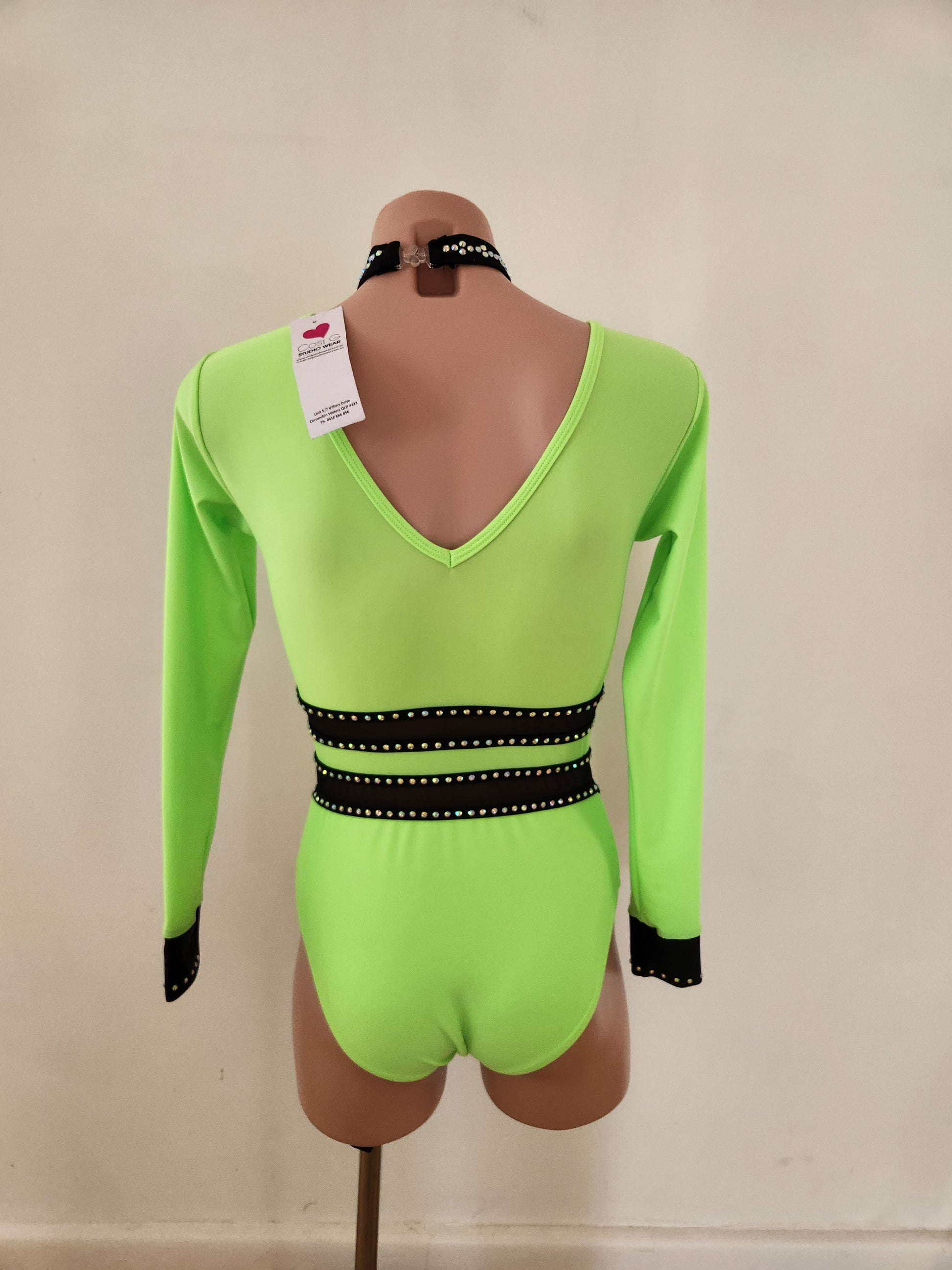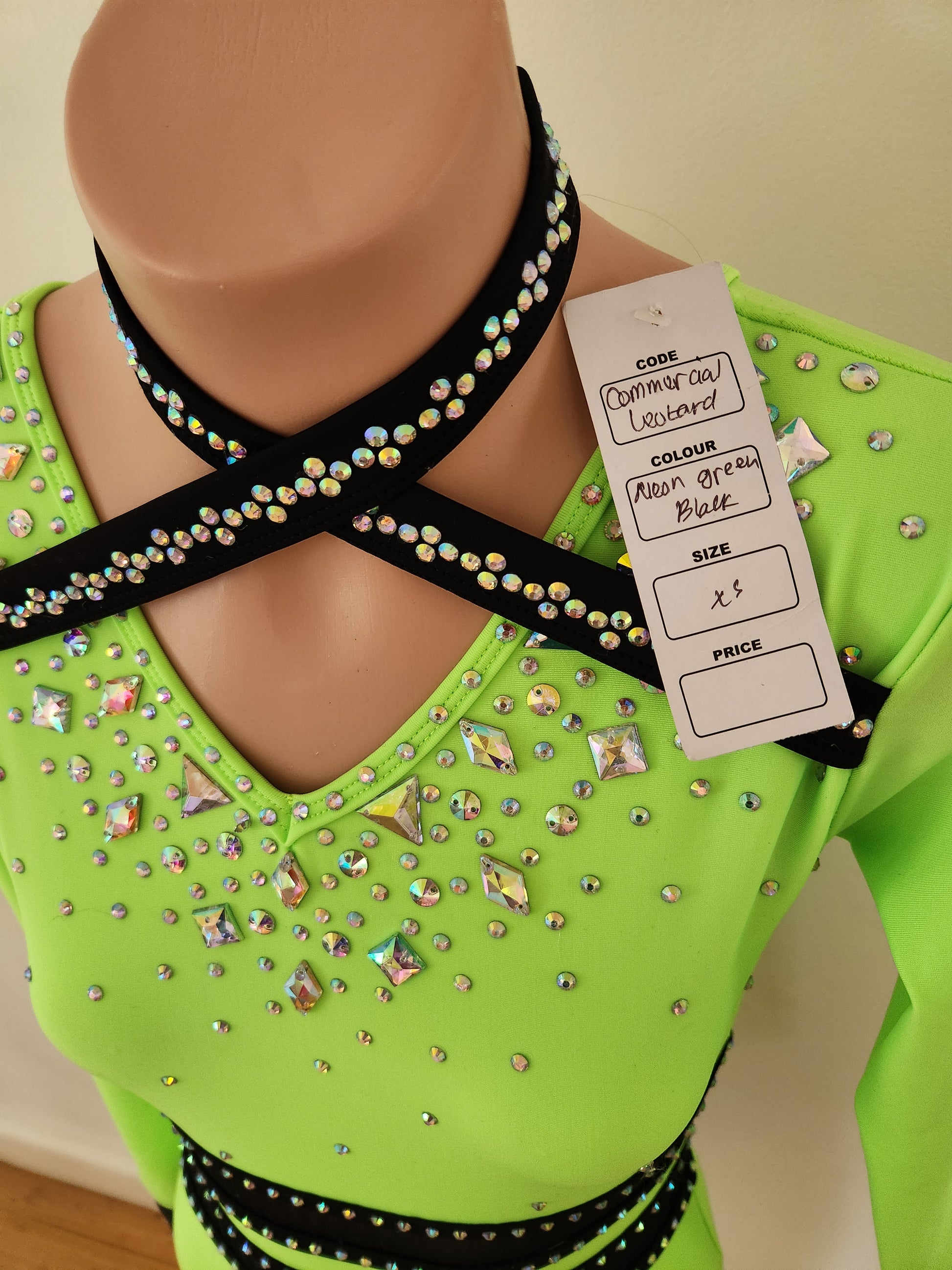 Brand new CosiG neon green Commercial leotards (RRP $110), blinged with AB gems. Would look great with a pair of black spats for a jazz routine.