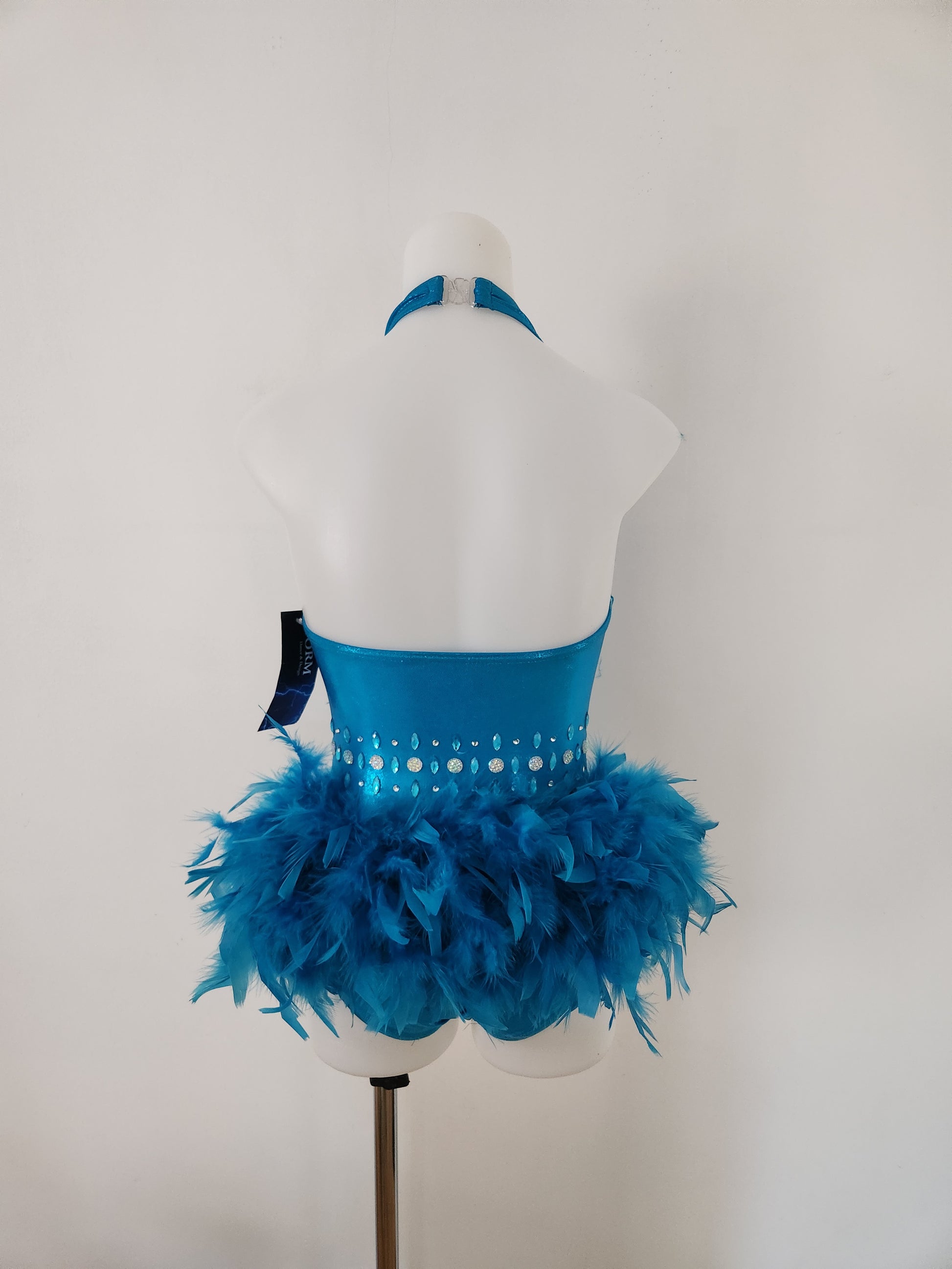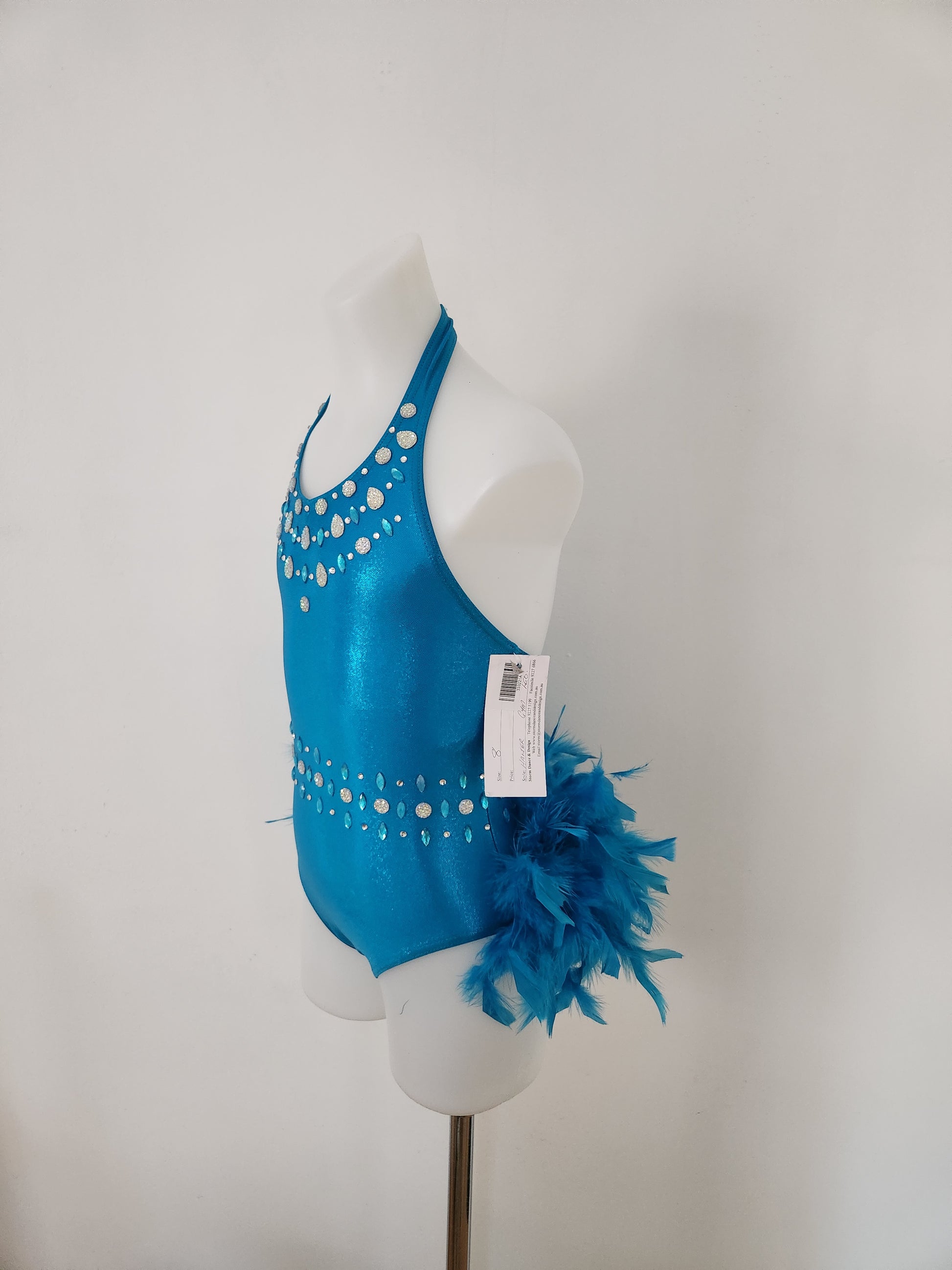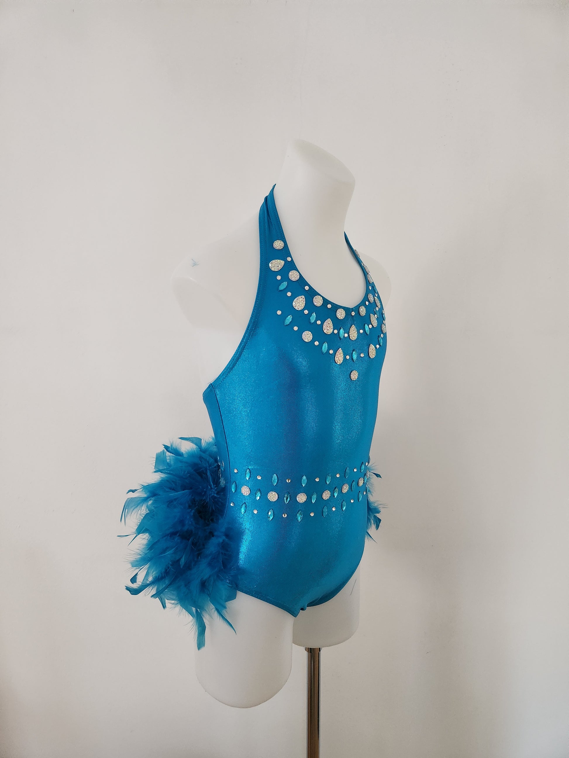 New metallic blue leotard (with tags on), blinged with gems and turquoise feathers.