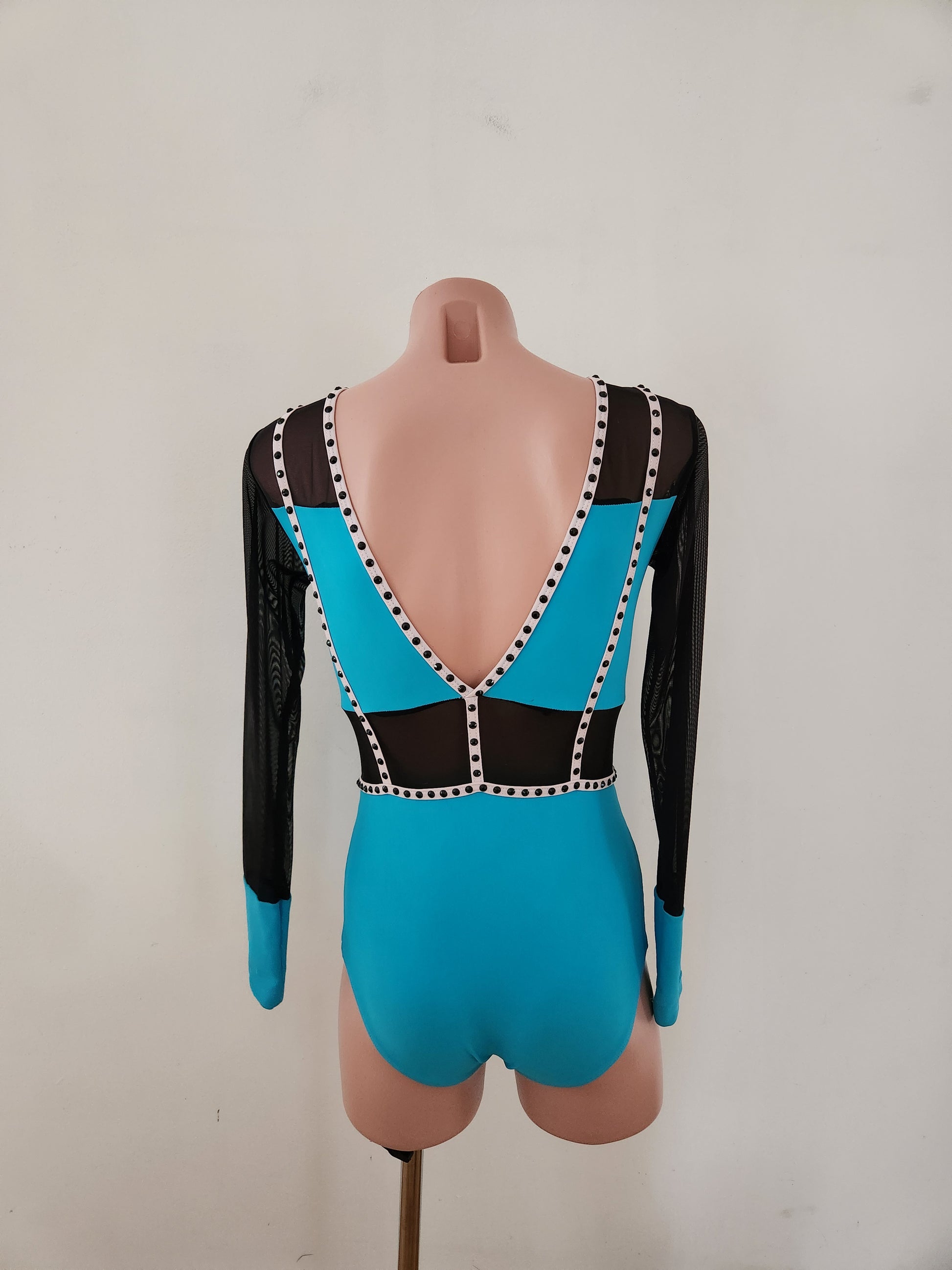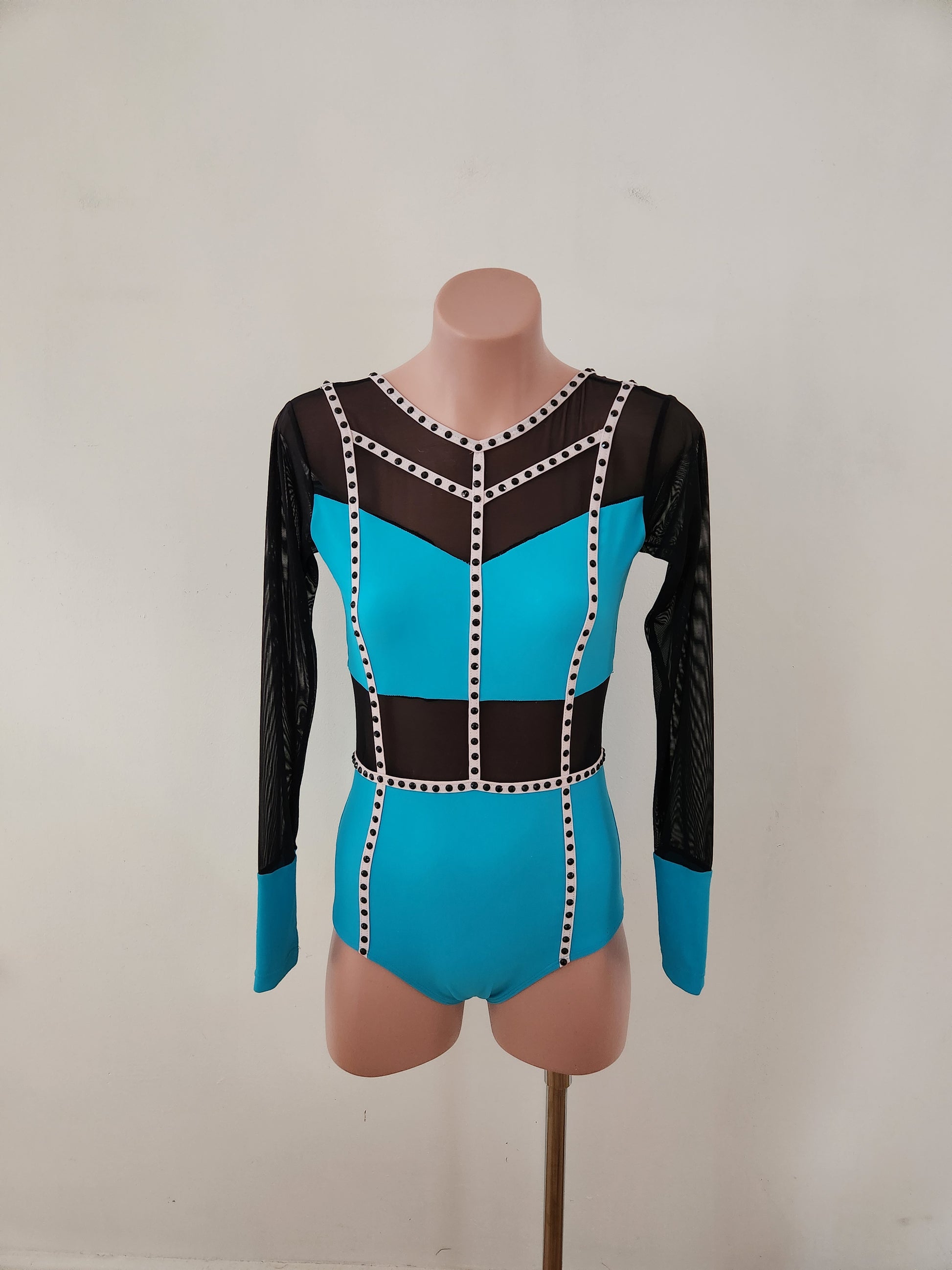 XS adult CosiG costume blinged with black gems. The base is pre-loved, but has been washed and is in good condition. There is a name on the inside size tag and there is a very small (1cm) feint pink mark on the inside lining, but otherwise it's in good condition. It would suit a 12-14 year old child or petite adult.