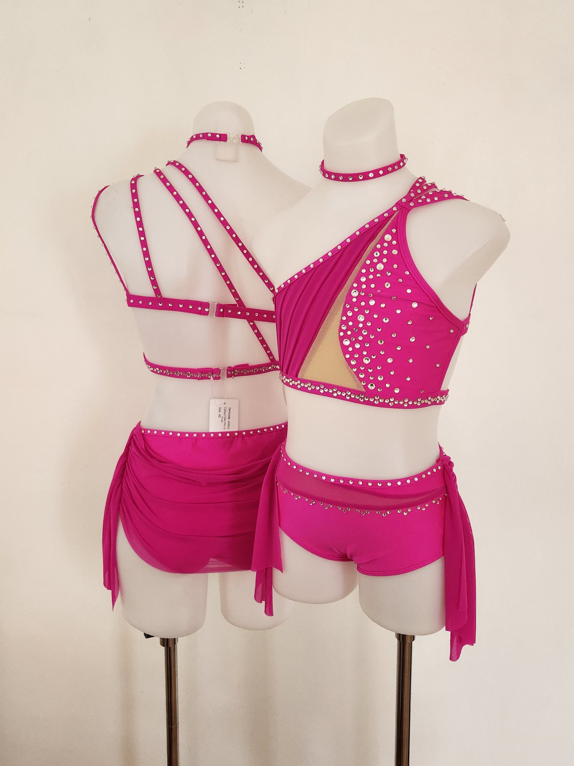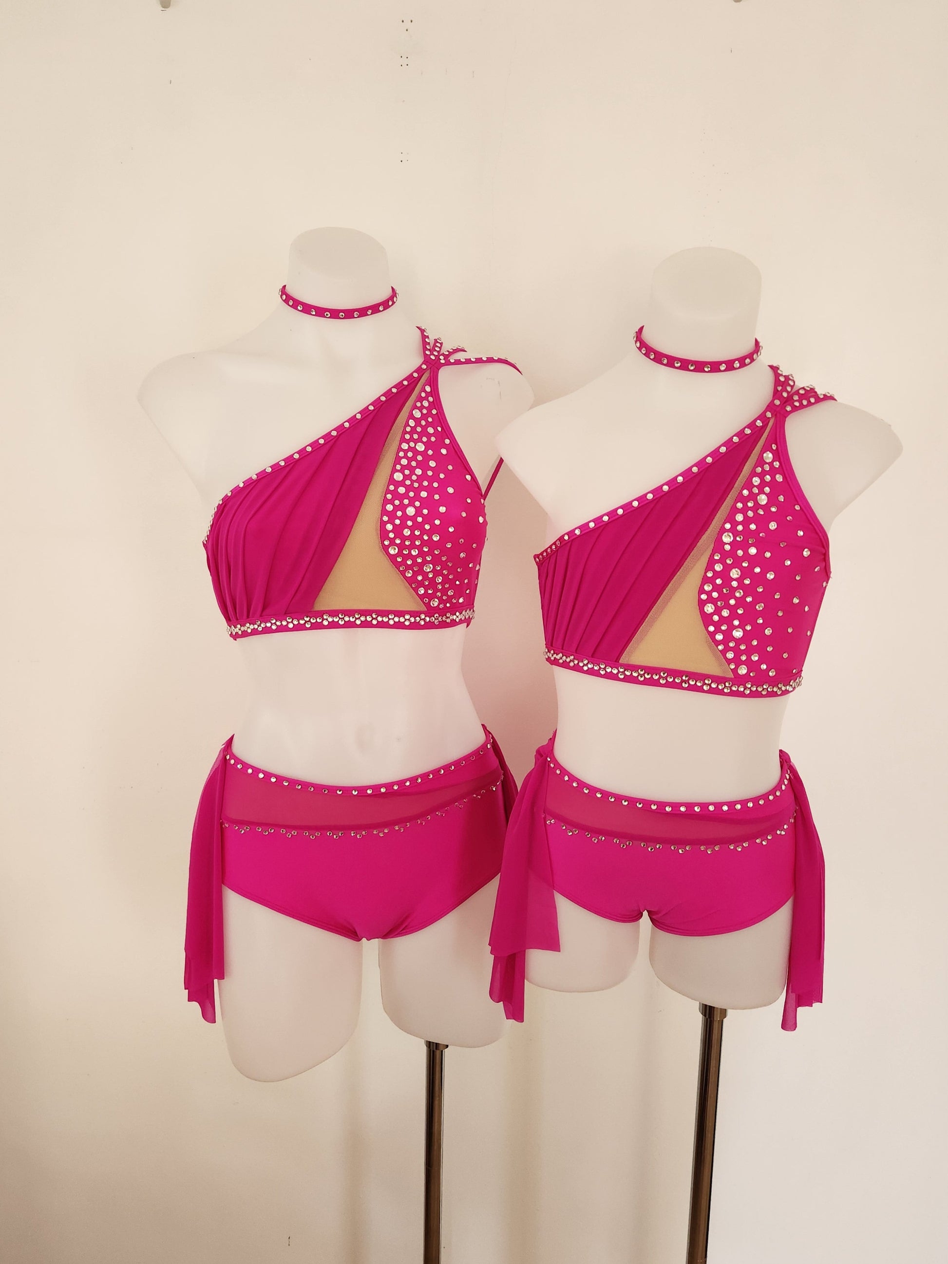 Stunning dark pink/magenta 2-piece costumes blinged with crystal rhinestones. They are brand new quality bases, fully lined, with tags. When on stage, the rhinestones on the front and back of the costume will sparkle and twinkle under the lights. Each costume has 2 matching wrist/armbands with diamantes (see last pic for details).